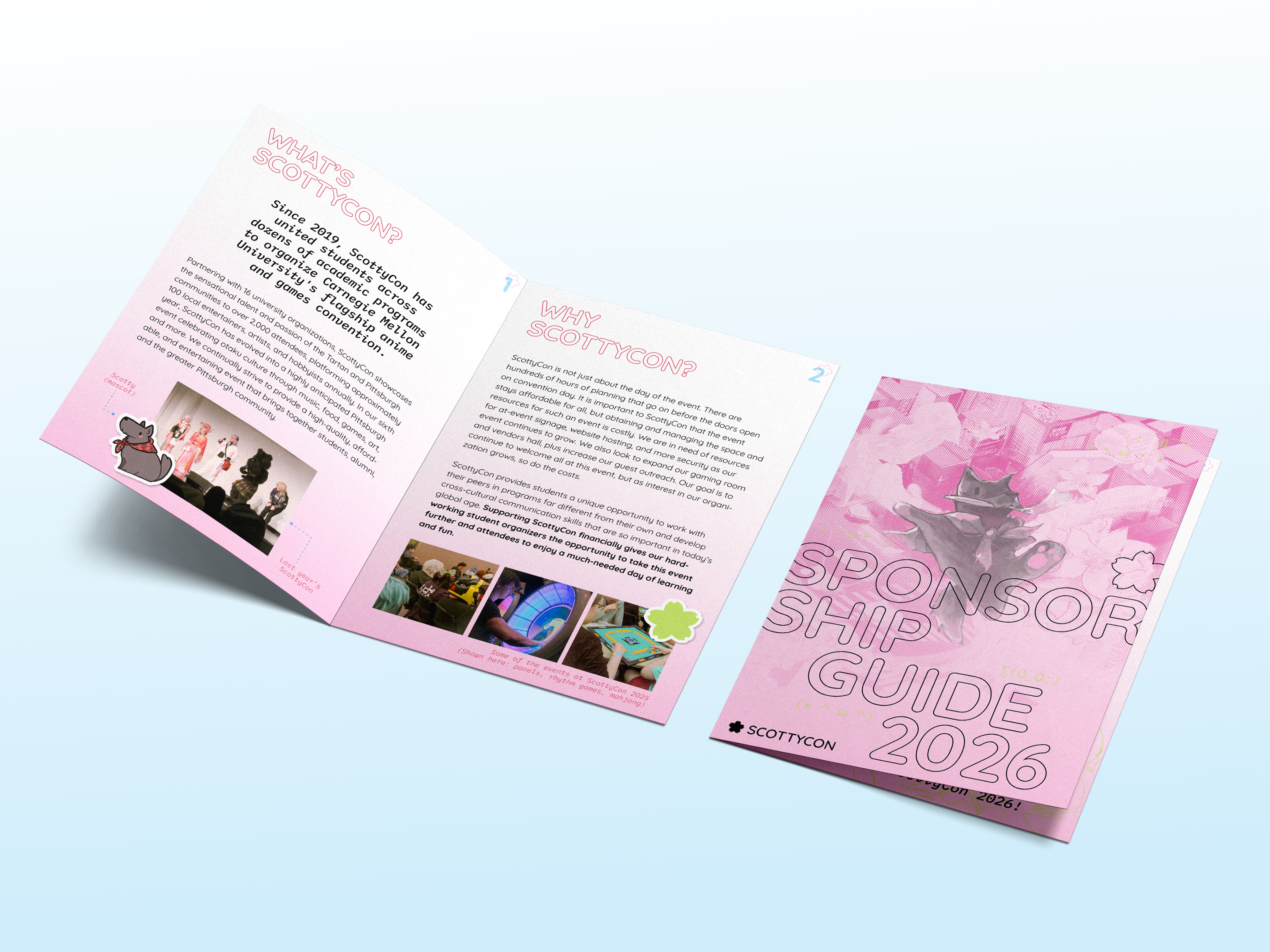 As graphic design chair of ScottyCon, an annual student-run convention that takes place at Carnegie Mellon University, I aimed to refine the visual style of the event’s design, in order to have a more cohesive graphic identity. I led a small team to create promotional material, such as event signage, newsletters, social media posts, and an informational packet for sponsors.